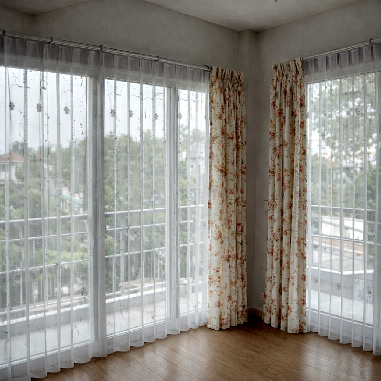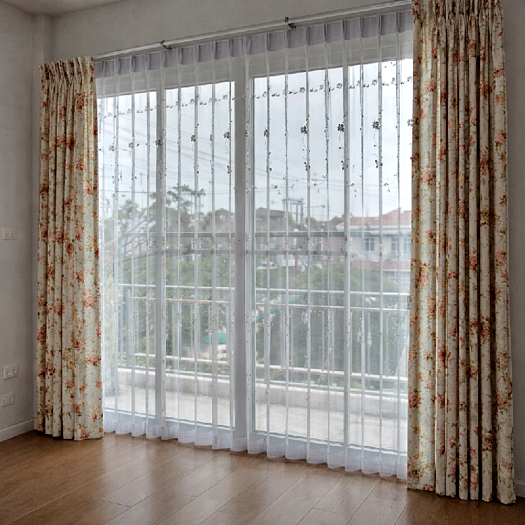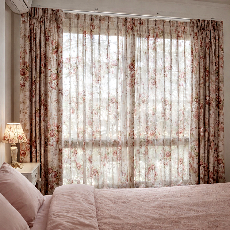ม่านจีบลายดอกไม้ตกแต่งห้องนอนสไตล์อบอุ่น พร้อมผ้าม่านโปร่งรับแสงธรรมชาติ